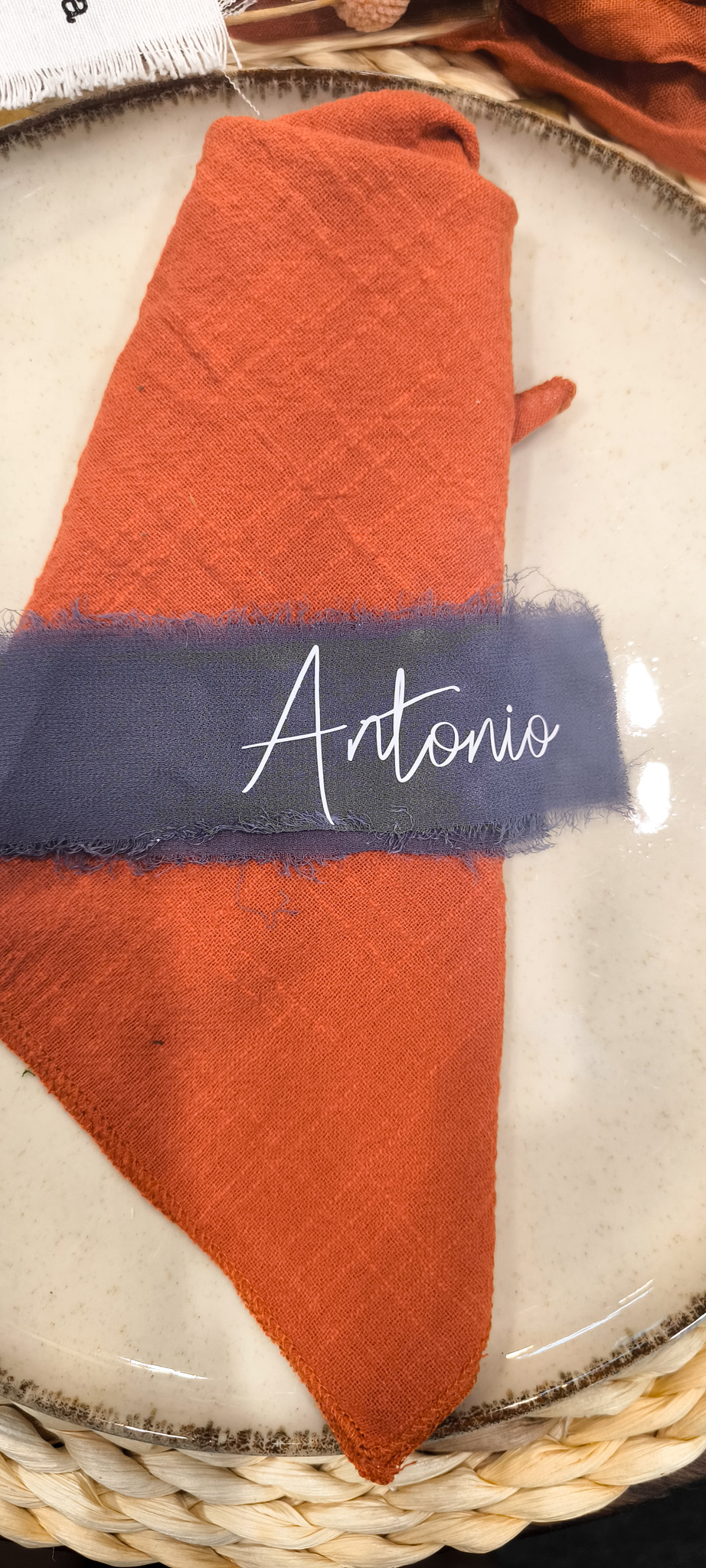 Dale personalidad y calidez a tu mesa con nuestro marcasitio en cinta de tela, una pieza pensada para aportar elegancia artesanal a cualquier evento.